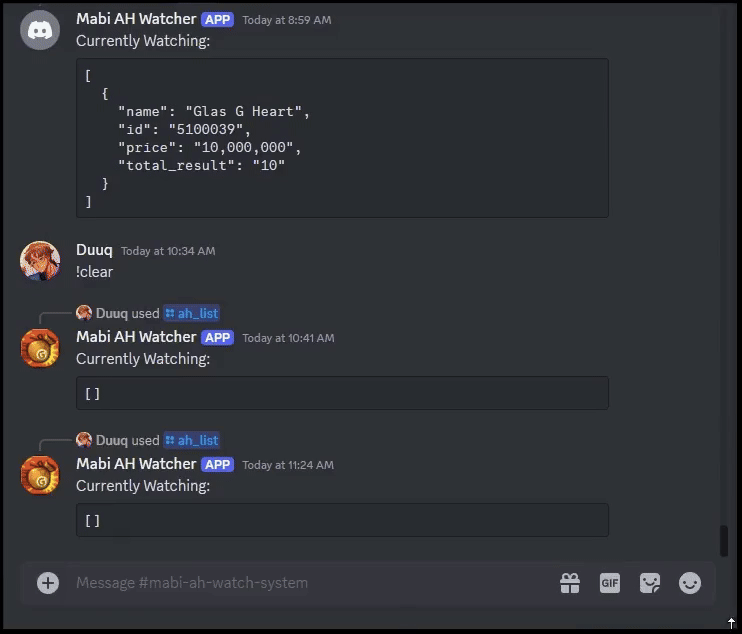 This Python-based Discord bot queries MabiBase for new items and alerts users if they match specified criteria. It supports item watch lists, editing, and deletion, with data stored on MongoDB Atlas Cloud. Users can input and edit desired items via built-in Discord forms.